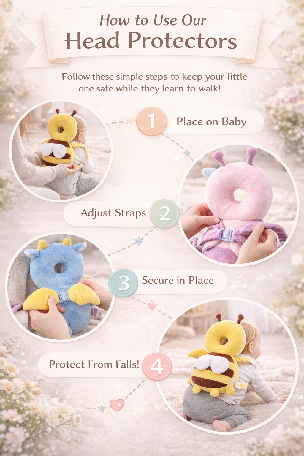 The cushion helps absorb impact to the head and upper back during small falls while your baby is learning to sit, crawl, and walk. It’s designed to add an extra layer of protection during everyday play.